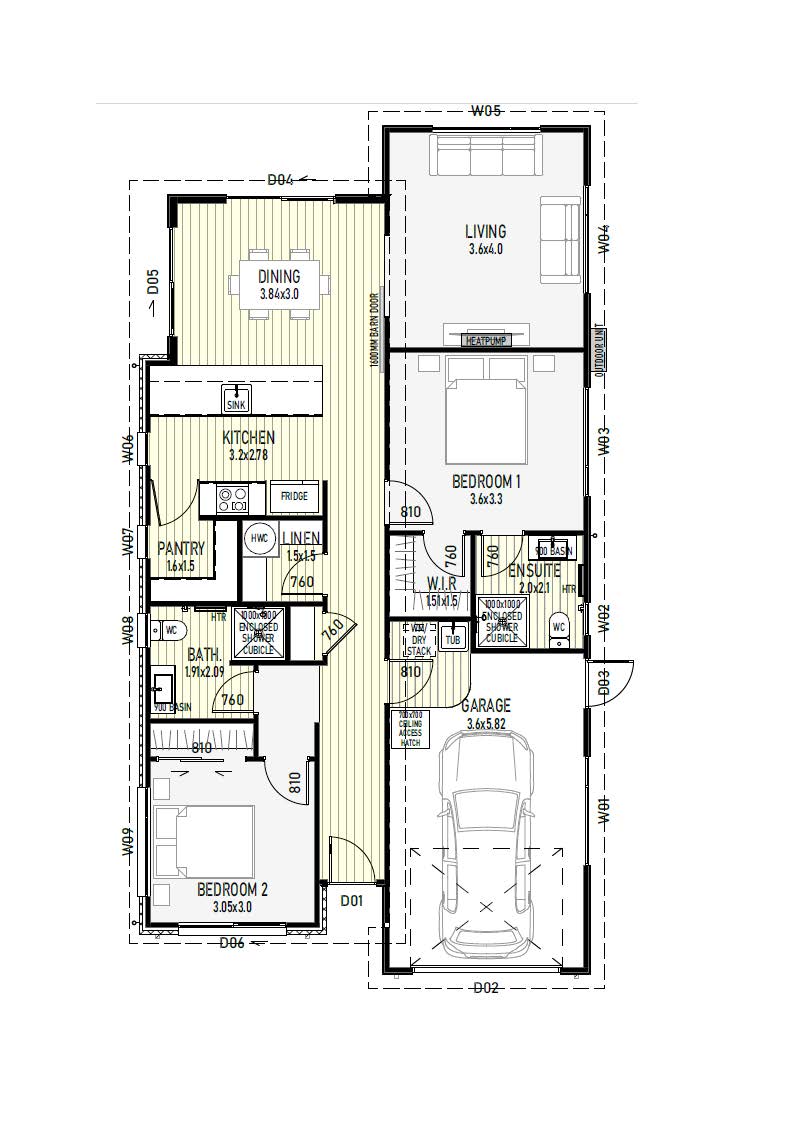 - Open-plan kitchen, living, and dining area, heat pump in the living room